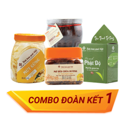 Combo Đoàn Kết 1 gồm: Mơ ngâm đường 0,65kg, Mứt gừng 200g, Trà Phật độ 50g, Mơ dẻo Chùa Hương 300g